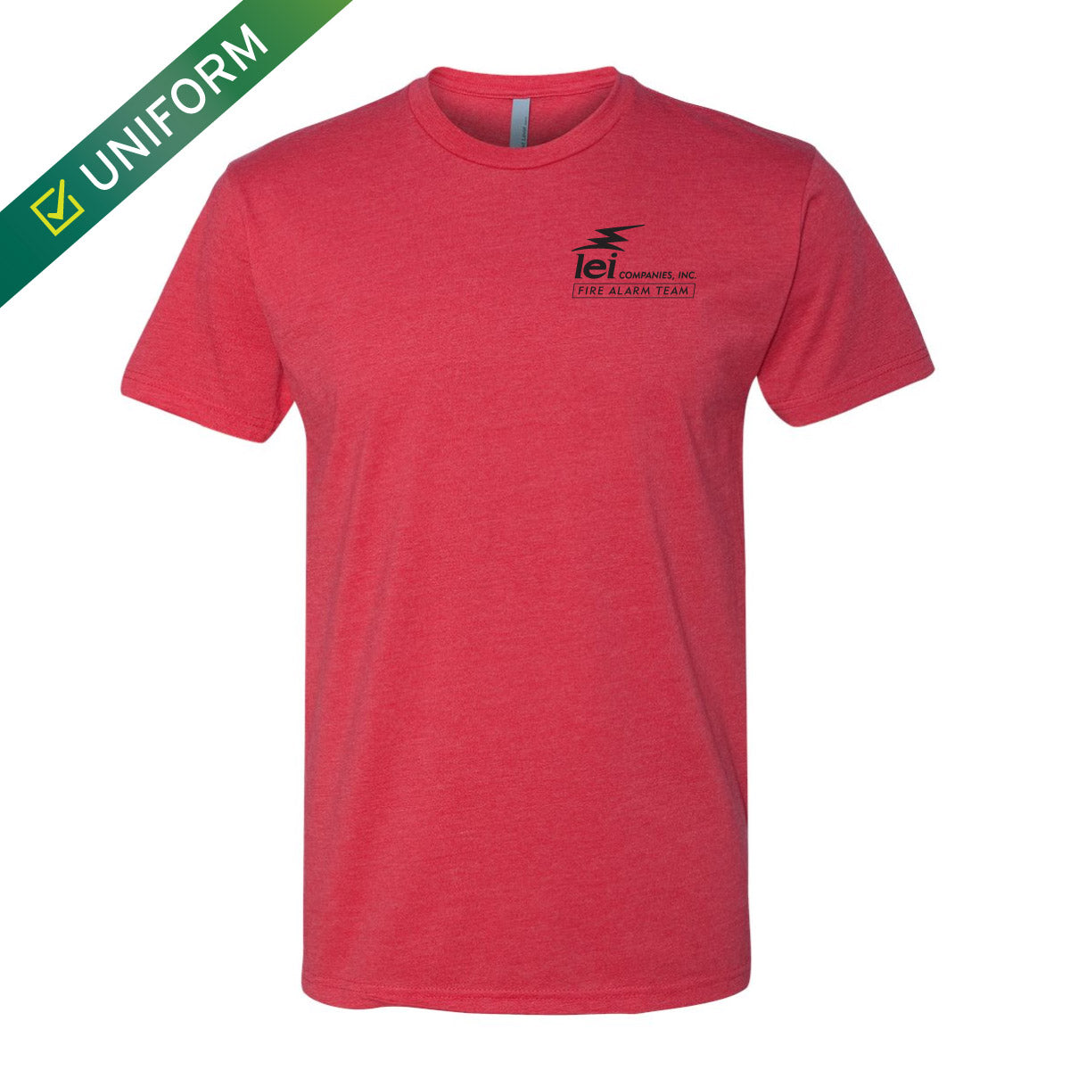 A super soft, premium cotton/poly short sleeve t-shirt in a red heather color with the Fire Alarm Team logo on the left chest.